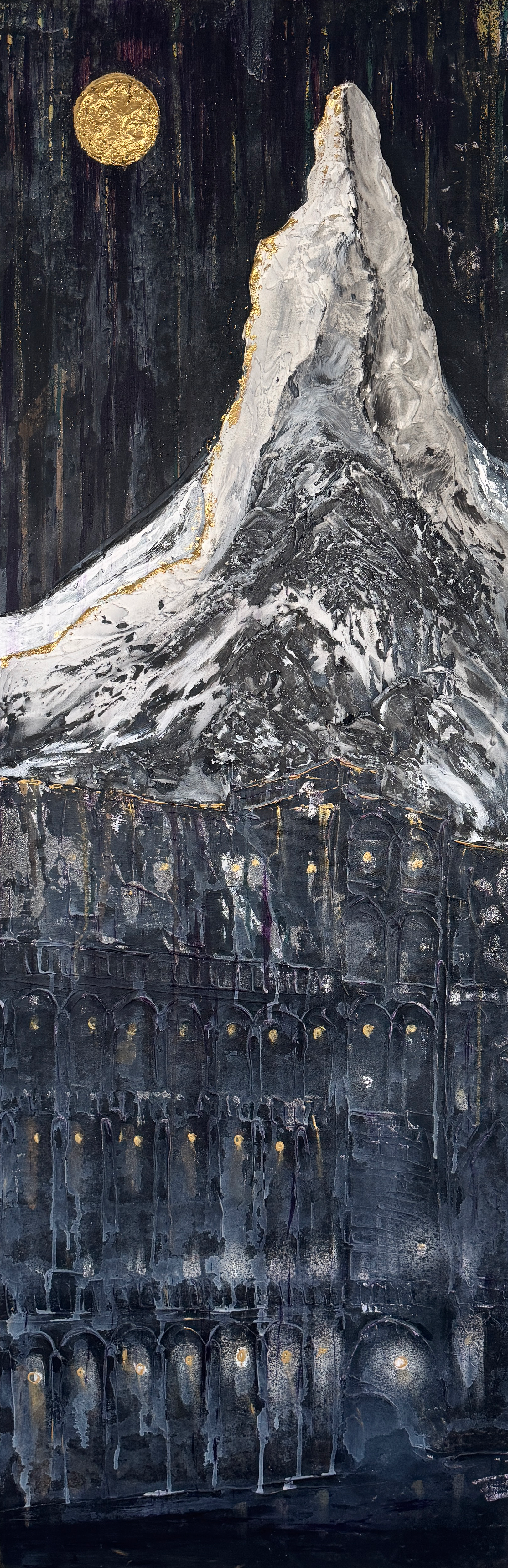 Intentions. Mixed media on canvas. 19 x 59 inches.